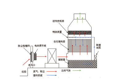 負壓吸塵除臭系統(tǒng)的吸風(fēng)口安裝在垃圾壓縮設(shè)備的上料防塵罩上,利用受上料感應(yīng)控制的抽風(fēng)機,將防塵罩內(nèi)形成負壓,將垃圾傾倒形成的揚塵、臭氣收集至處理塔中,經(jīng)過處理塔內(nèi)自下而上的生化填料層、噴淋、活性炭過濾層等多級凈化處理,保證排放符合環(huán)保標準。